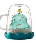This double-walled custom glass mug features a whimsical tree design with floating snowballs—like sipping from a snow globe. The easy-grip handle and removable silicone cover help keep your tea warm and your hands comfortable.
